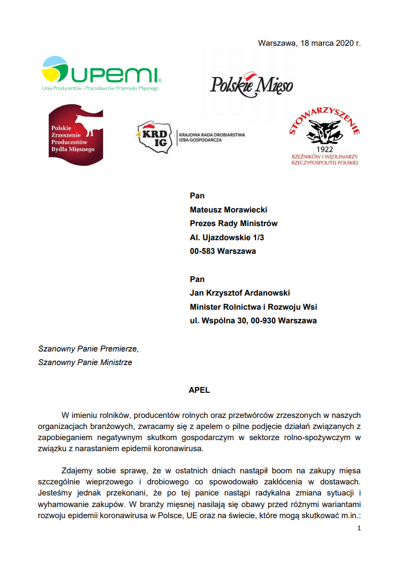 APEL branży mięsnej do Prezesa Rady Ministrów i Ministra Rolnictwa o pilne podjęcie działań związanych z zapobieganiem negatywnym skutkom gospodarczym w sektorze rolno-spożywczym w związku z narastaniem epidemii koronawirusa.