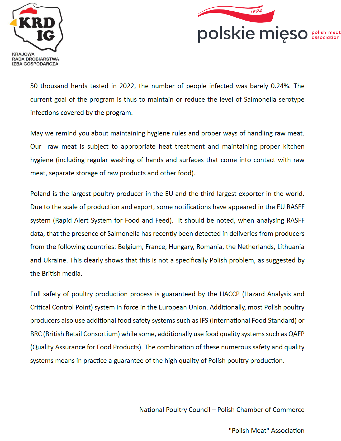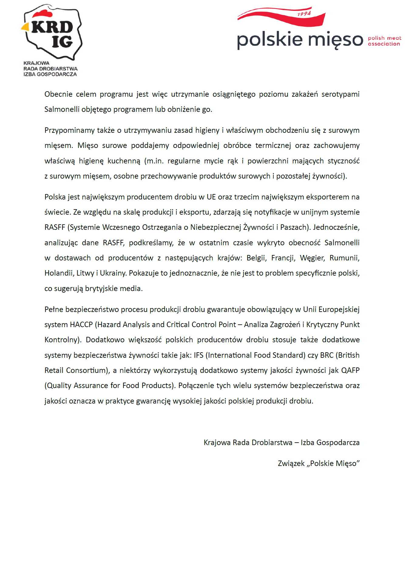 OŚWIADCZENIE Krajowej Rady Drobiarstwa-Izby Gospodarczej i Związku „Polskie Mięso” w sprawie publikacji pojawiających się w brytyjskich mediach na temat mięsa drobiowego